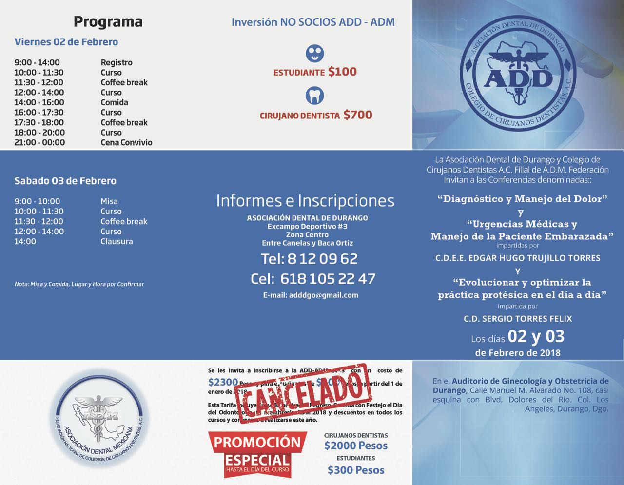 Los pasados dias 2 y 3 de febrero la Asociación Dental de Durango y Colegio de Cirujanos Dentistas A.C. filial ADM, llevo a cabo su primer curso bimestral, en el que se contó con la participación como conferencistas de los Dres. Hugo Trujillo Torres y Sergio Torres Félix.